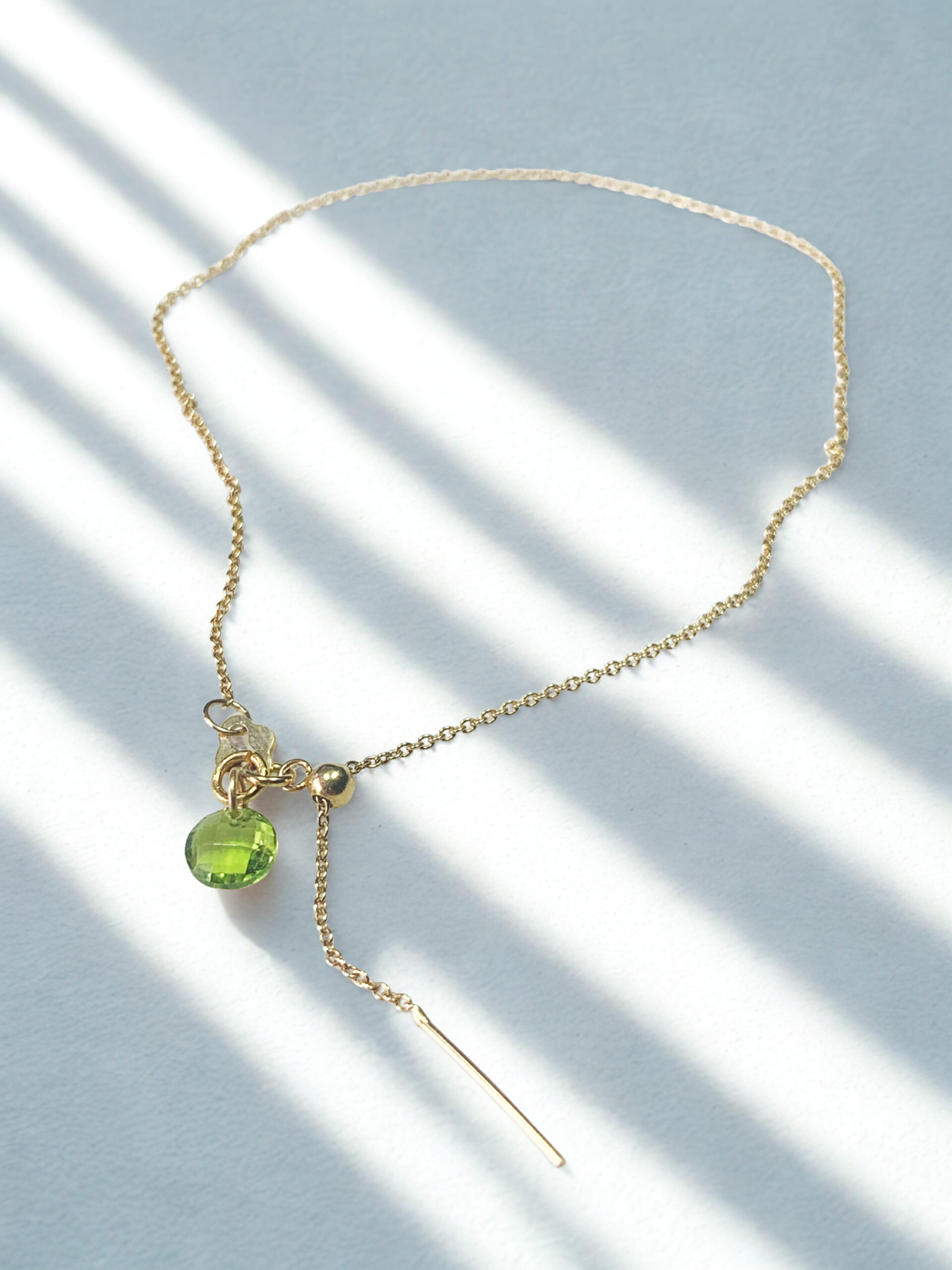 Délicat et lumineux, le bracelet Épure incarne la sobriété précieuse d’un bijou intemporel. Une chaîne fine en argent massif 925 plaqué or (0,5 micron) traverse avec légèreté le poignet, ornée d’une perle facettée de Péridot naturel de 4 mm, pierre de lumière associée à l’harmonie et à la vitalité. Ce vert tendre apporte une touche subtile de couleur, idéale pour les beaux jours.