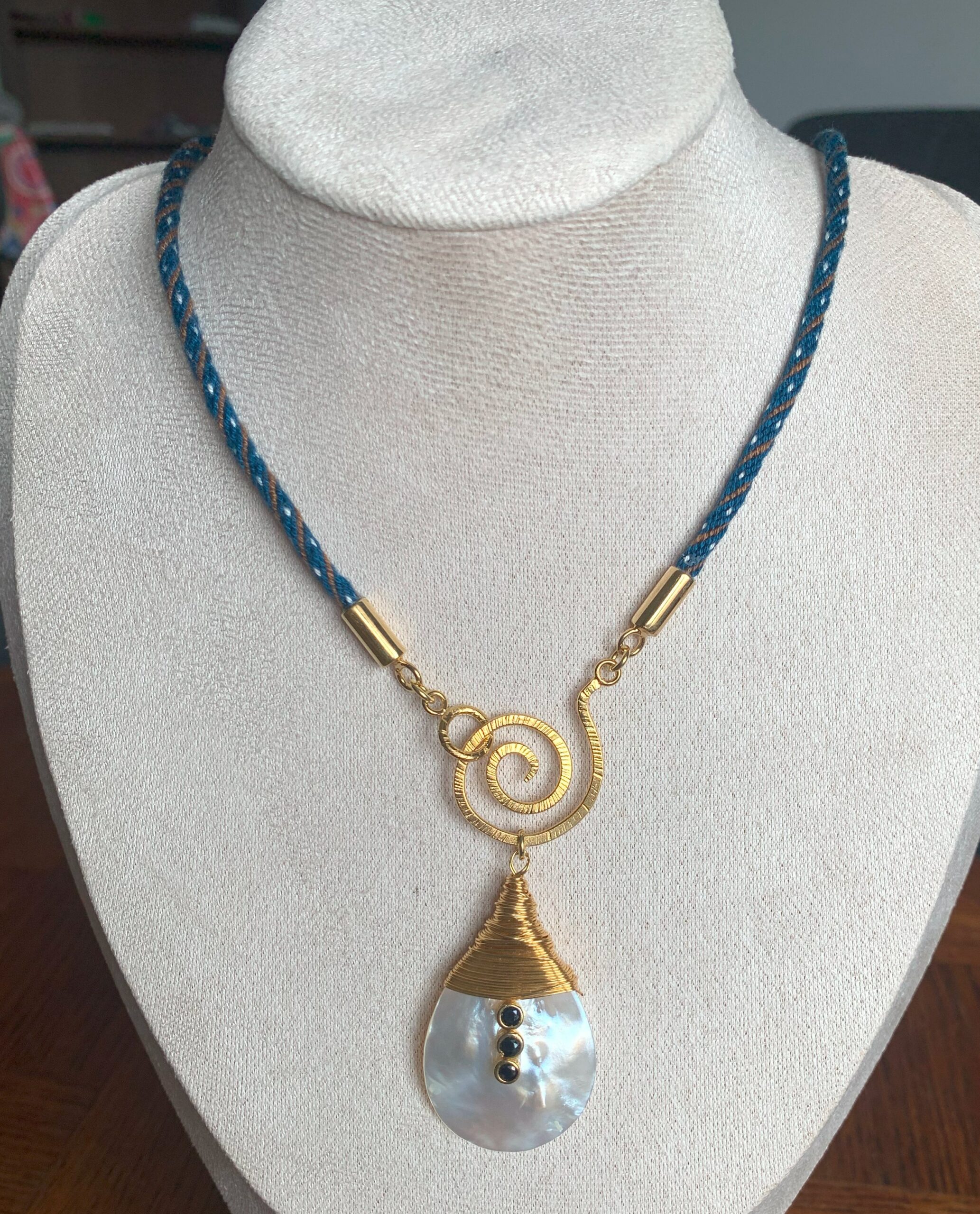 Ce tressage ancestral, ici décliné en bleu profond et doré lumineux, confère au bijou un toucher souple, une brillance texturée et un port confortable. Le pendentif, en nacre naturelle, est délicatement serti de fil de laiton doré et orné de trois perles noires en verre, évoquant des éclats de nuit sur une mer calme. L’ensemble est sublimé par un fermoir spirale en argent 925 plaqué or 18Kt, apportant une touche contemporaine et précieuse.