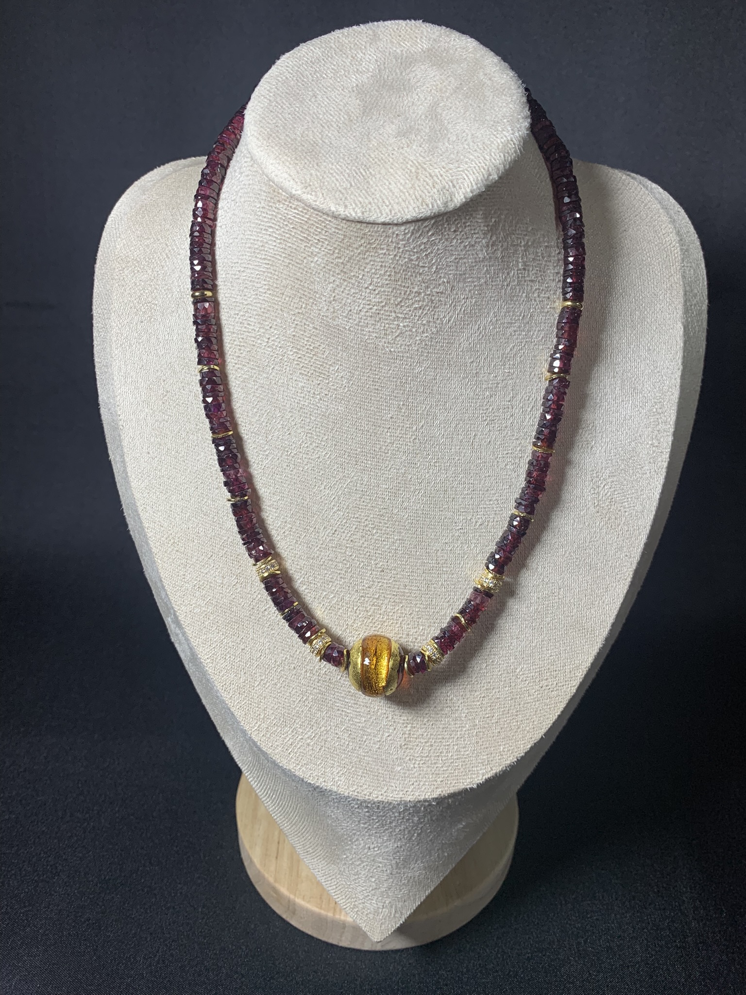 Composé de perles Heishi en grenat facetté, ce collier s’illumine d’une majestueuse perle de Murano soufflée à la main, incrustée de feuille d’or. Les apprêts en argent doré à l’or fin complètent cette pièce unique aux accents vénitiens et solaires.