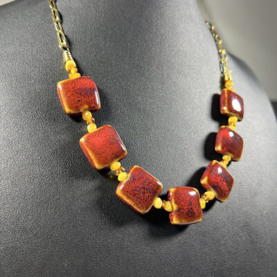 Le montage est réalisé sur un fil bijoutier discret mais solide, assurant confort et durabilité. Le collier se ferme à l’aide d’un fermoir Toogle en argent massif 925 plaqué or 18Kt (épaisseur 0,5 micron), complété par des apprêts assortis. Une finition à la fois solaire et élégante, qui souligne la richesse des matériaux sans jamais alourdir l’ensemble.