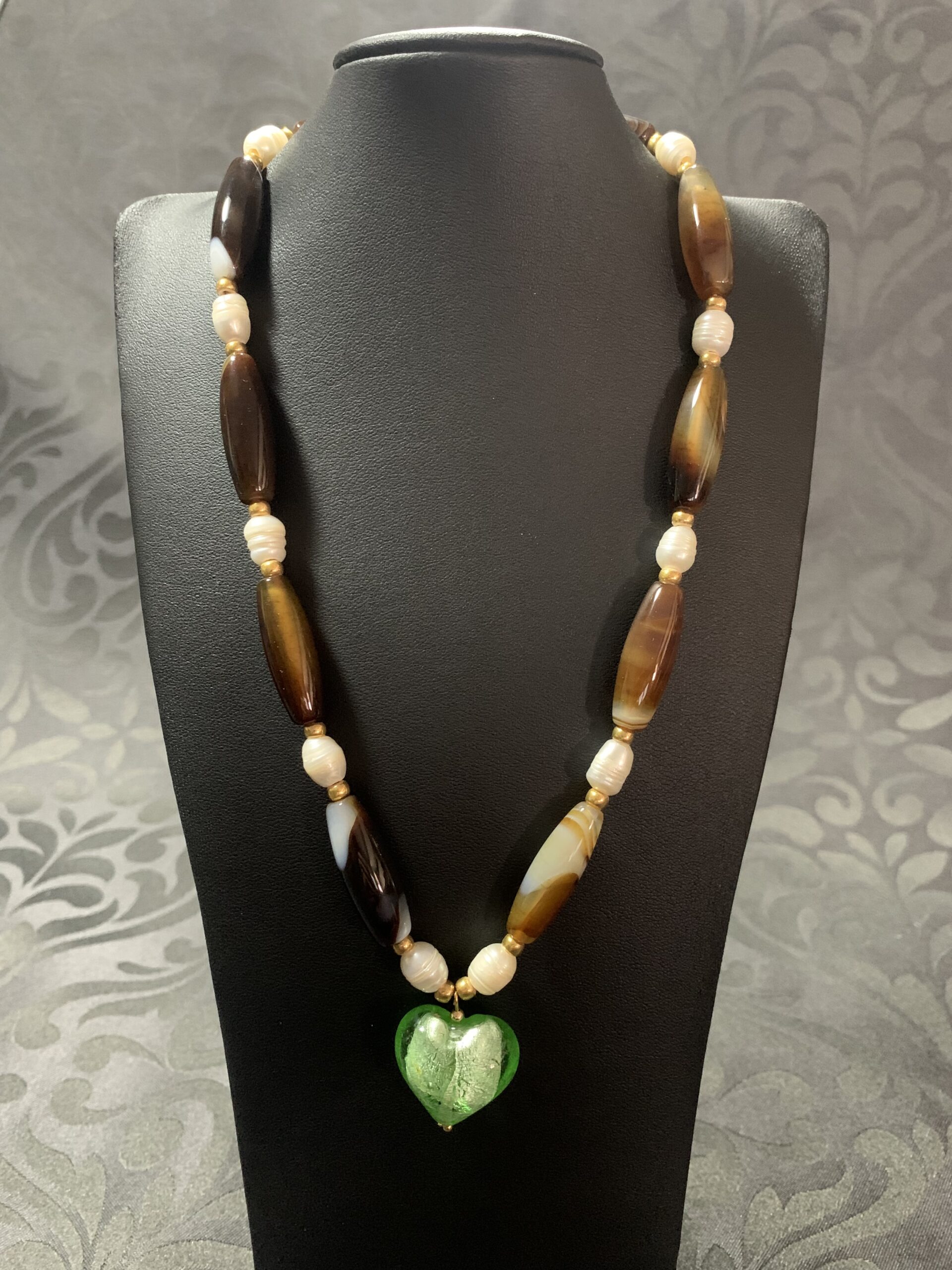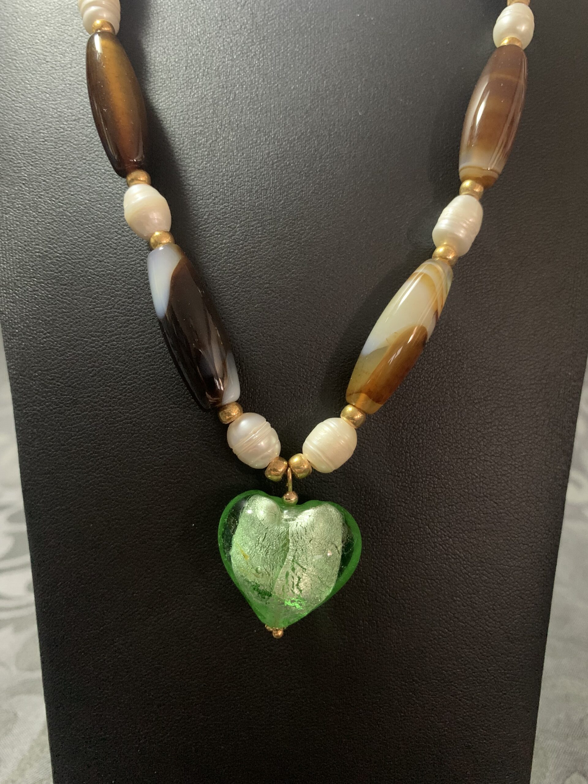 Les perles oblongues d’agate, aux teintes chaudes et terreuses, symbolisent l’ancrage et la sérénité. Elles s’entrelacent avec la douceur nacrée des perles de culture, dans un équilibre de textures et de reflets subtils. Au centre, le pendentif en forme de cœur, soufflé à la main à Murano, brille d’un vert éclatant, comme une déclaration de lumière et d’émotion.