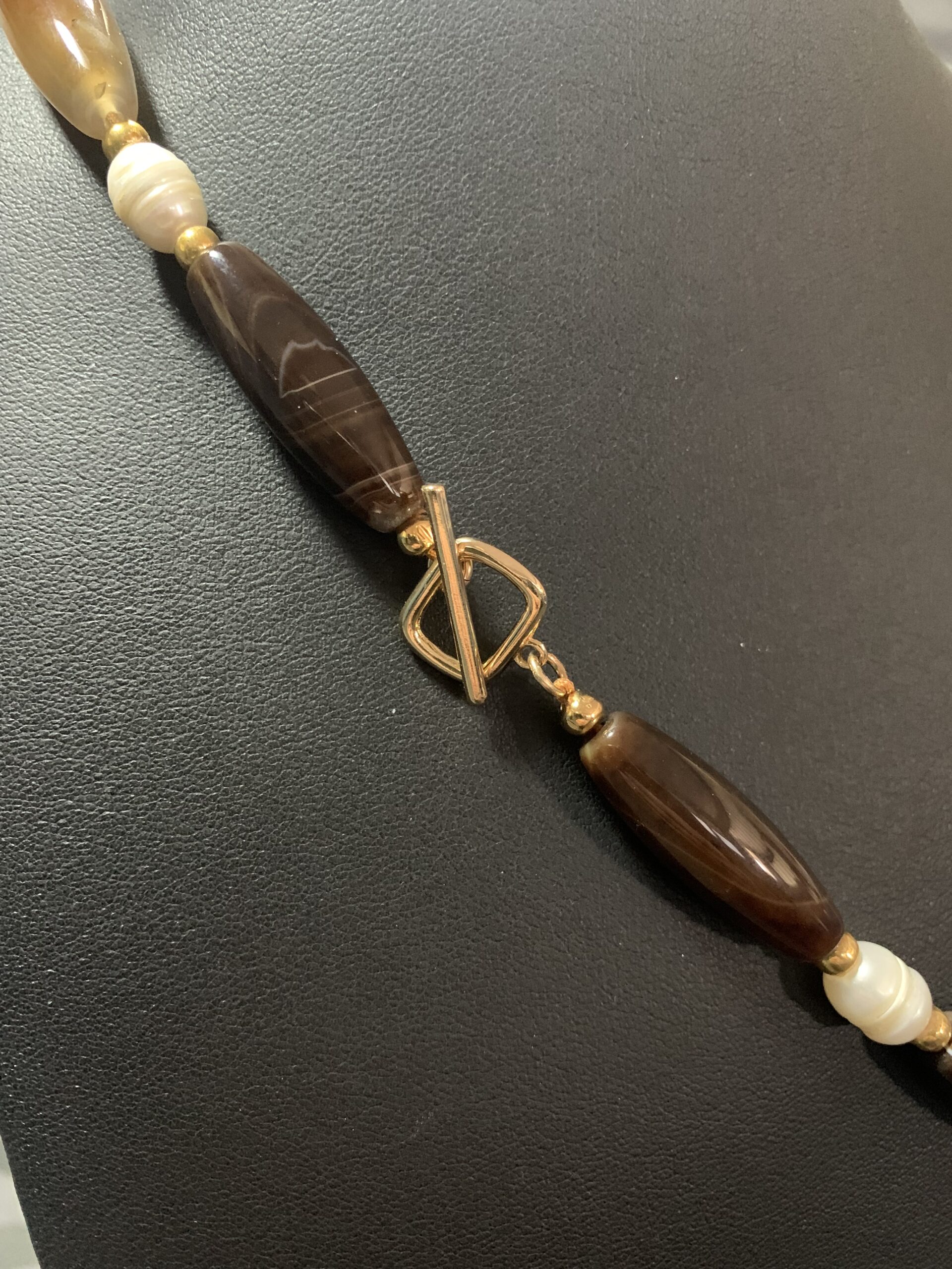Un bijou au charme intemporel, où les teintes chaudes de l’agate naturelle rencontrent la nacre irisée des perles de culture.