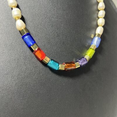 Le collier Prisma Perla mêle l’intensité des perles cubes en verre de Murano, la brillance du cristal tchèque et la douceur organique d’une grosse perle de culture d’eau douce, comme un point d’ancrage lumineux au cœur du bijou.