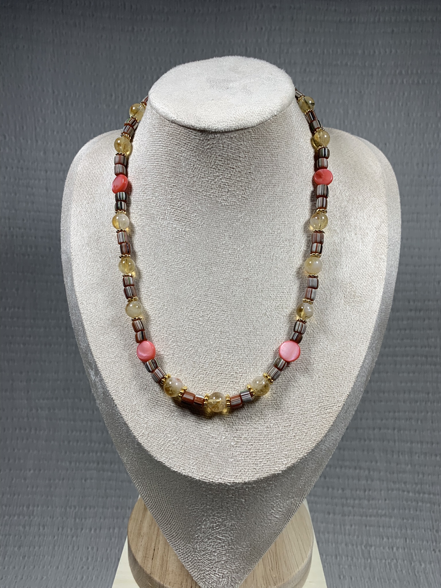 Ce collier lumineux évoque les couleurs chaudes et vibrantes de l’été. Il est composé de perles de Java artisanales, aux reflets subtils et irréguliers, associées à des perles en pierre naturelle de citrine, connues pour leur éclat doré et leur symbolique de joie et d’énergie solaire. Des perles de nacre aux reflets rosés viennent adoucir l’ensemble par leurs reflets irisés. Le collier est terminé par un fermoir en argent massif 925 plaqué or 18 kt (0,5 micron), apportant une finition élégante et précieuse à ce bijou solaire.