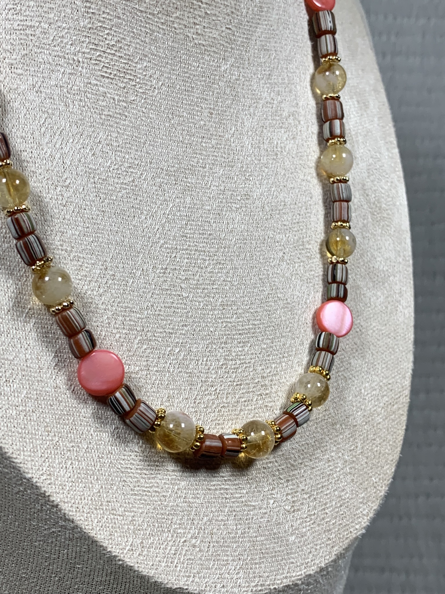 - Perles de Java, citrine, nacre rose, argent massif plaqué or 18 kt